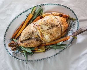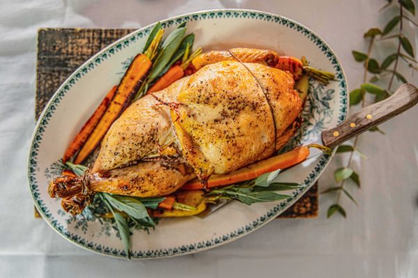 Verwarm de oven voor op 200°C. Smeer de kip goed in met zachte boter en bestrooi met peper en zout. Schuif de oranjehoen in de oven en verlaag na 20 minuten de temperatuur naar 120°C. Bestrijk de kip regelmatig met een kwast met het vet en de vleessappen, die je in de slee of op de bakplaat opvangt. Als de kip te snel bruint, kan je deze met aluminiumfolie afdekken. Haal de oranjehoen na een uur uit de oven en dek losjes met aluminiumfolie af. Laat de kip nog een kwartier rusten voordat je je pronkstuk aansnijdt.