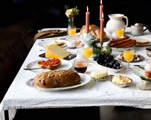 tarwebloem, roomboter, ei, rozijnen, krenten, vijgen, sinaasappelolie, amandelen, zeezout, sinaasappelconfijt, citroen, zuurdesem (water, tarwebloem)