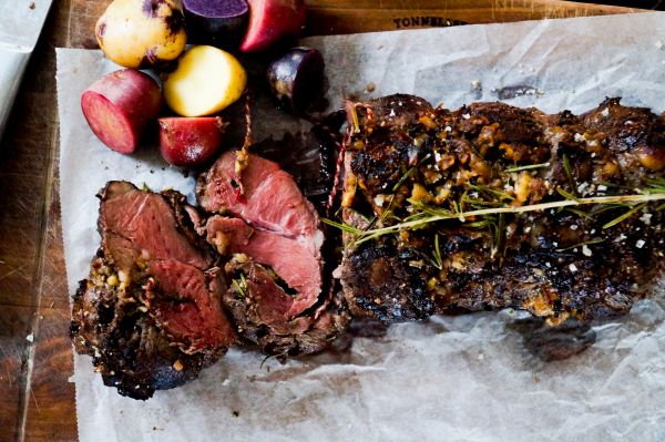 Voor het eventuele vullen: Knip het netje van de rollade los en vouw het vlees open. Bestrijk de rollade met de vulling en vouw voorzichtig dicht. Bind de rollade op met keukentouw en breng rondom op smaak met zout en peper. Garing: Verwarm de oven tot 150 graden. Verhit een koekenpan met roomboter en bak de rollade rondom goudbruin. Plaats vervolgens in een ovenschaal en giet het bakvet en eventueel jus erbij. Prik de kernthermometer in de rollade en laat de rollade garen tot deze een kerntemperatuur van 54 graden heeft bereikt (ongeveer 90 minuten). Keer halverwege en besprenkel met het kookvocht. Rol de rollade na het garen in aluminiumfolie en laat nog even rusten. Snijd de rollade in plakken en serveer met de jus of saus.